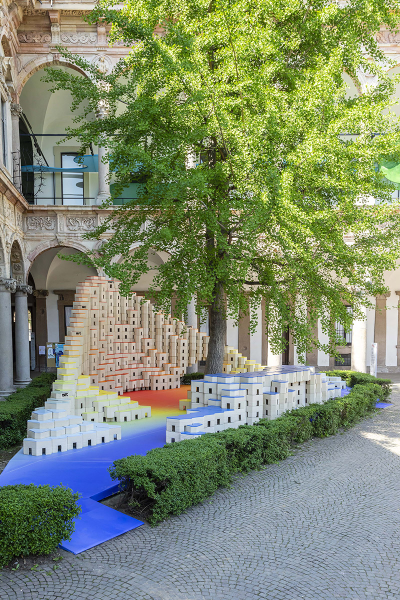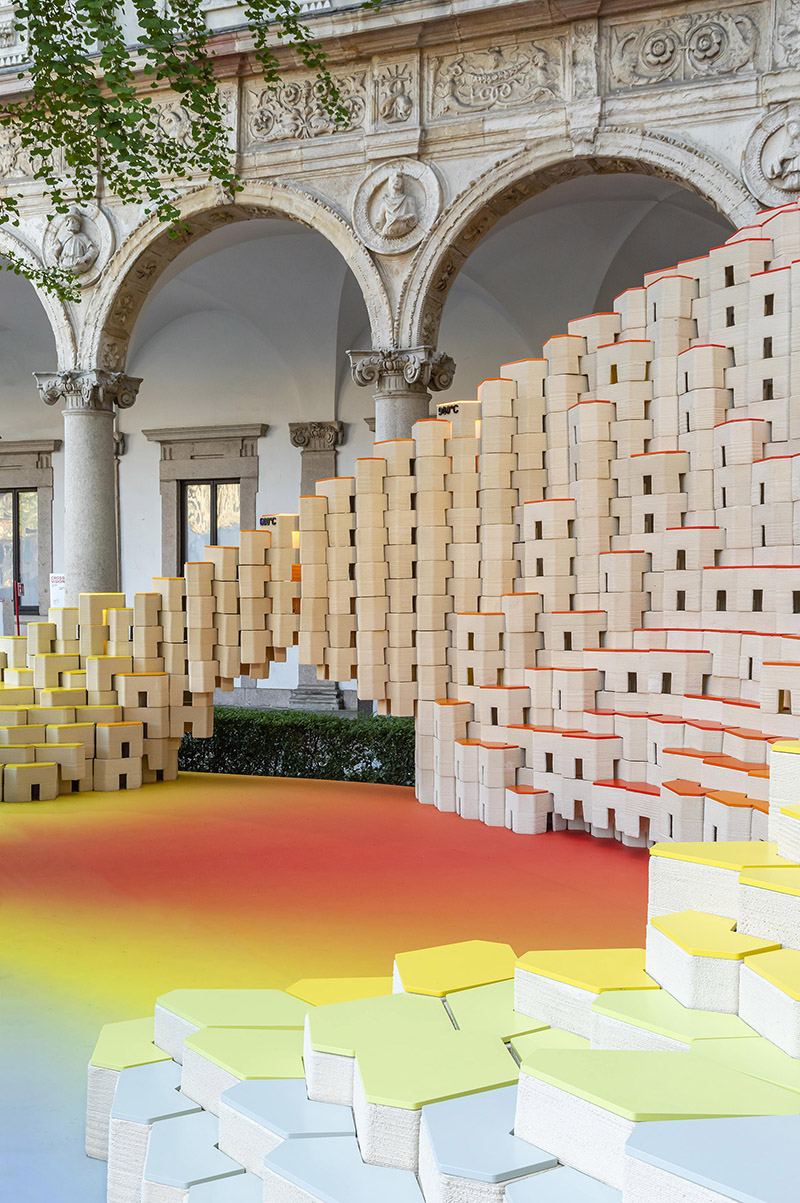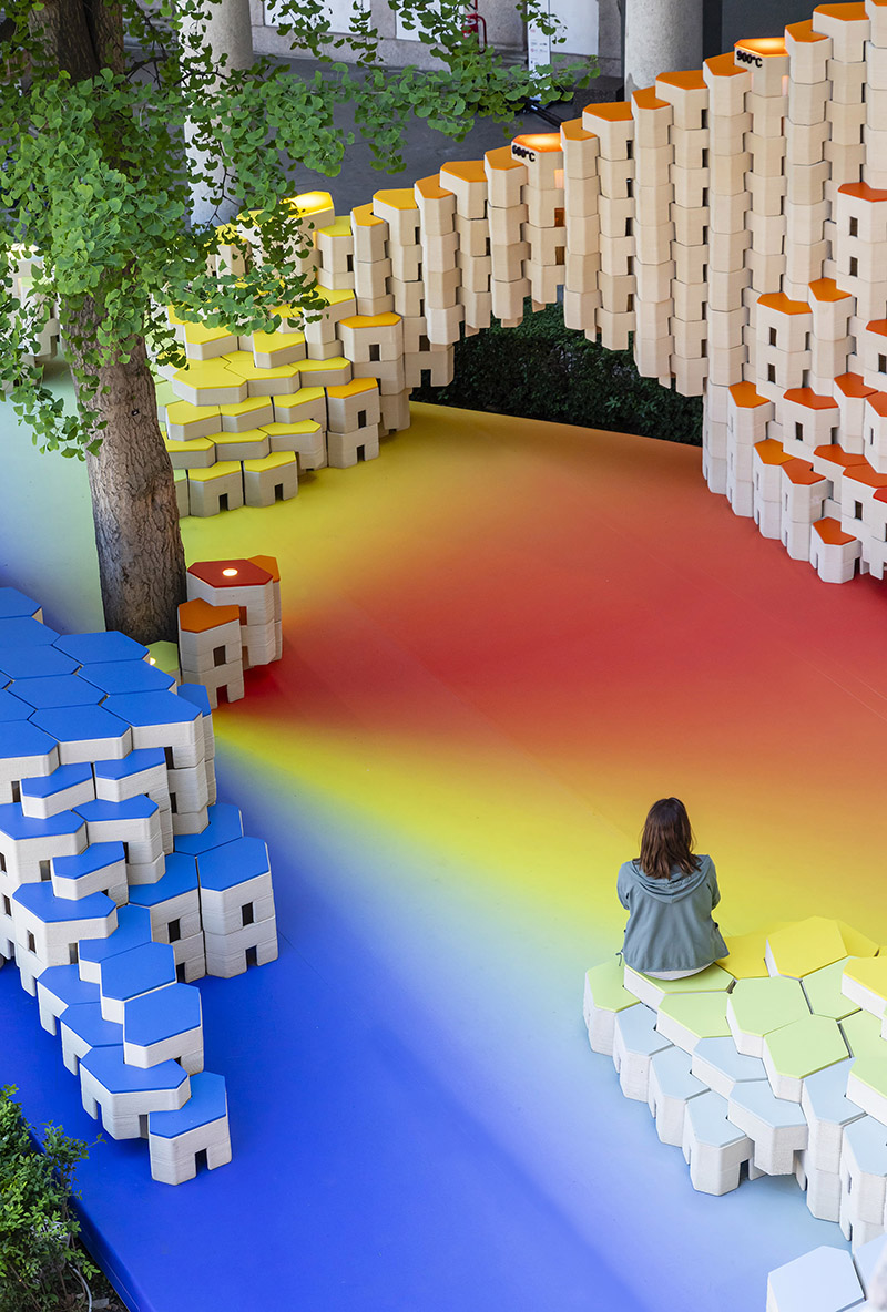 Progettata con una geometria curva, l'installazione si adatta ai contorni unici dell'ambiente circostante, offrendo diverse configurazioni spaziali e funzionali. Oltre al loro fascino visivo, questi blocchi versatili fungono anche da aree salotto, invitando i visitatori a rilassarsi, conversare e socializzare.