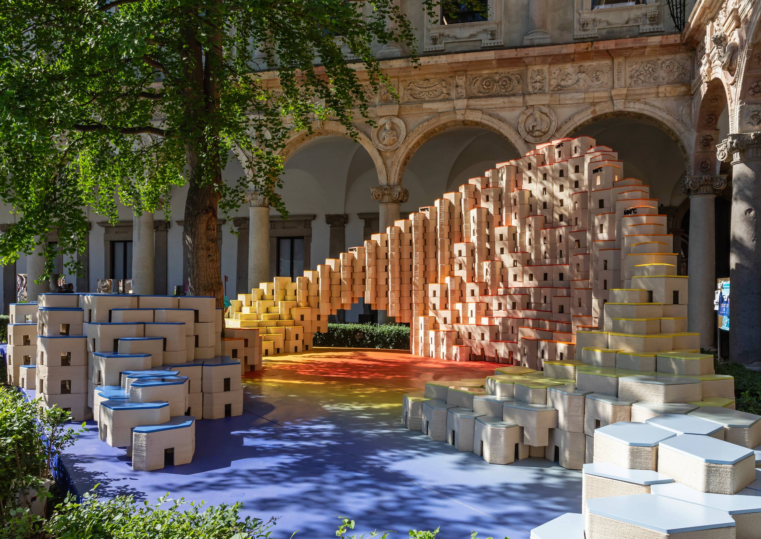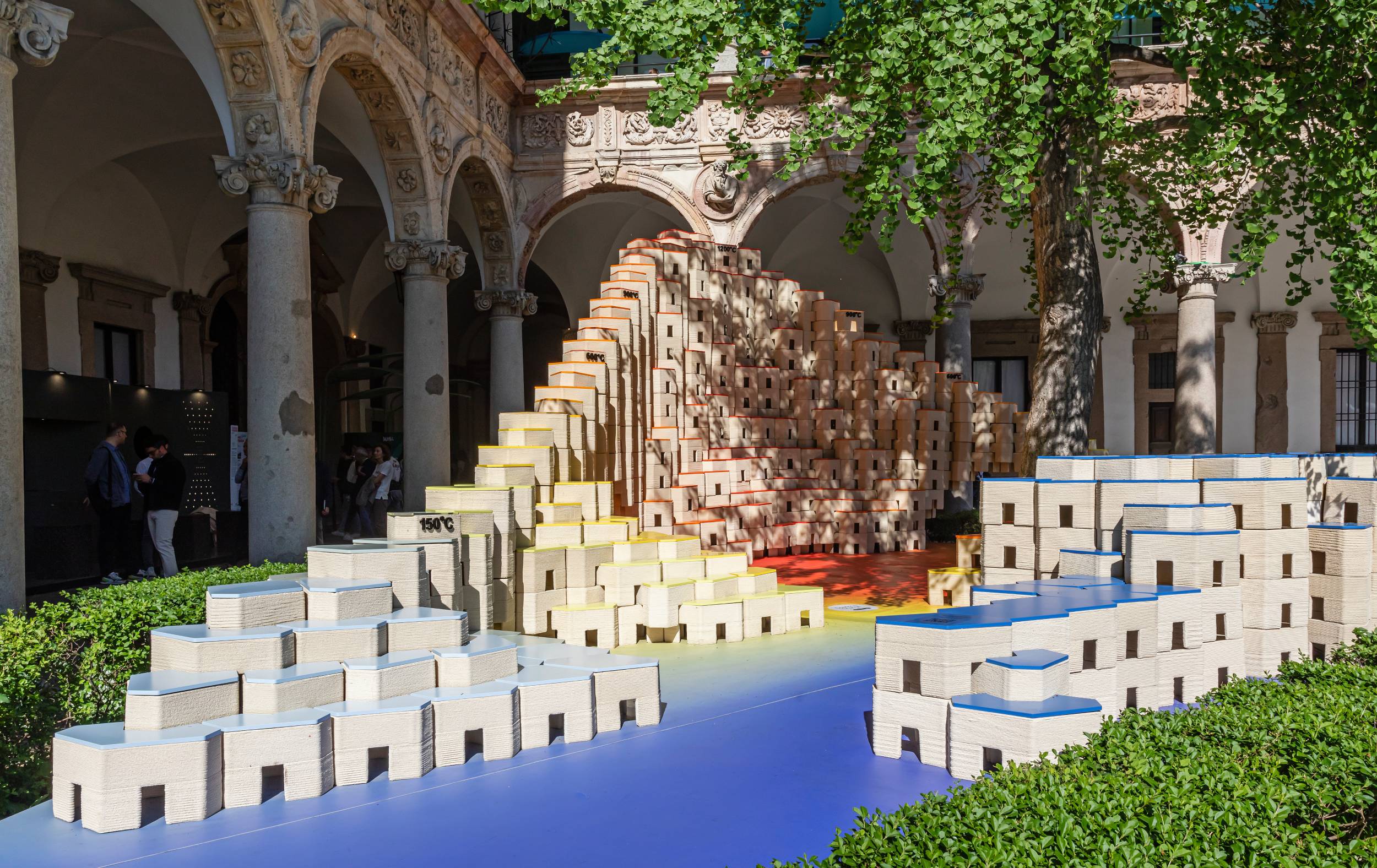 Ispirata dal recente lancio del primo forno a tunnel elettrico al mondo nello stabilimento di produzione Roca Group a Gmunden, in Austria, 'Sparking Change' racconta la storia del ciclo di rinnovamento che sostiene la sostenibilità. Costituita da 1.200 blocchi di ceramica stampati in 3D dai colori unici, l'installazione illustra vividamente le temperature progressive necessarie per ottenere prodotti ceramici di qualità superiore. Ogni blocco è integrato con dettagli che mostrano la temperatura raggiunta in ogni fase della produzione.