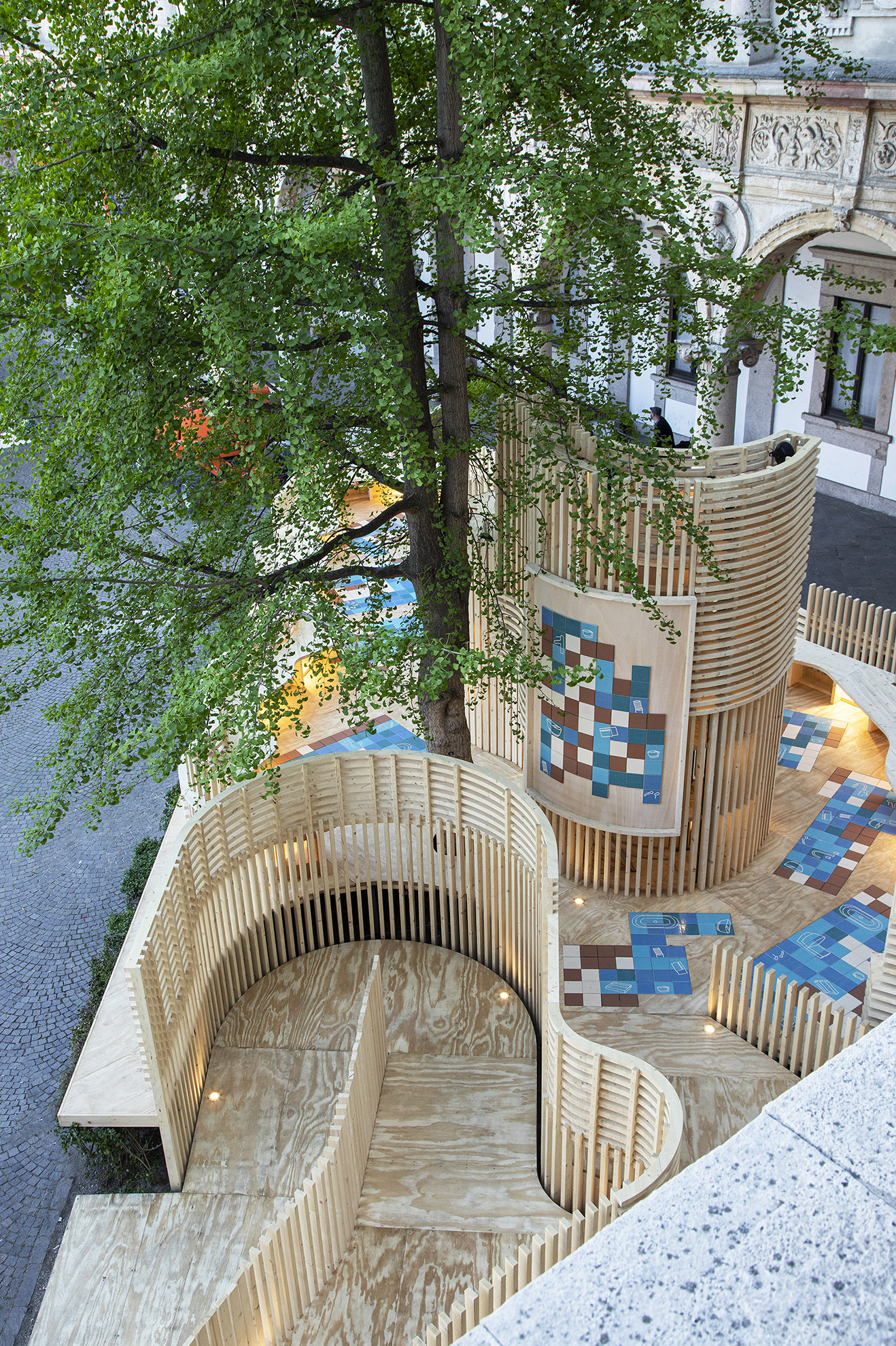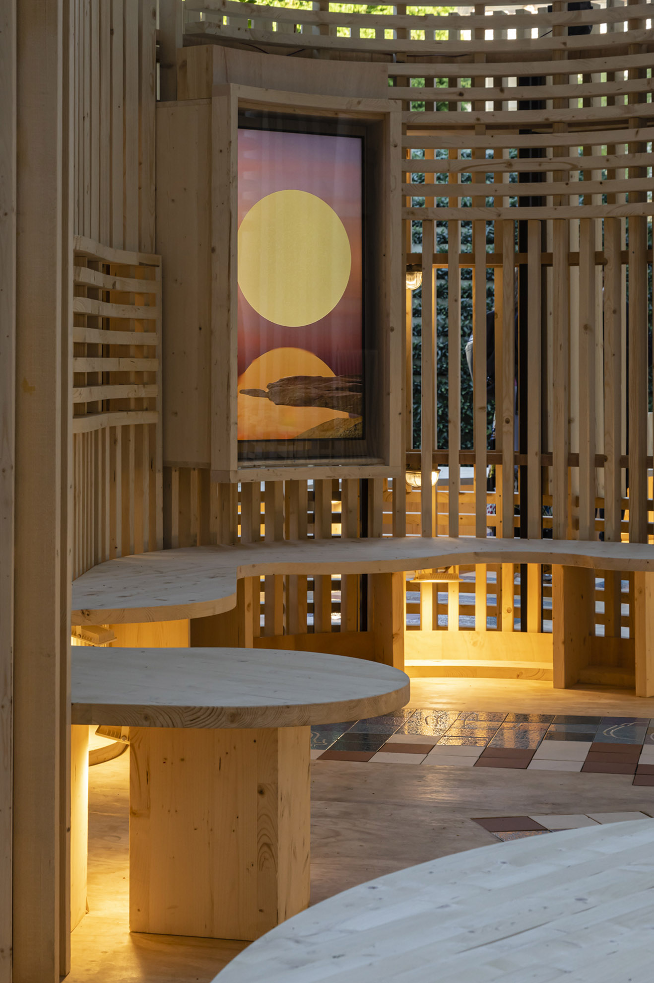 Questo padiglione progettato da Benedetta Tagliabue – EMBT Architects riecheggia l'essenza del Mediterraneo e riflette le ultime collezioni Nu e Tura di Roca, dei designer spagnoli Inma Bermúdez e Andreu Carulla.