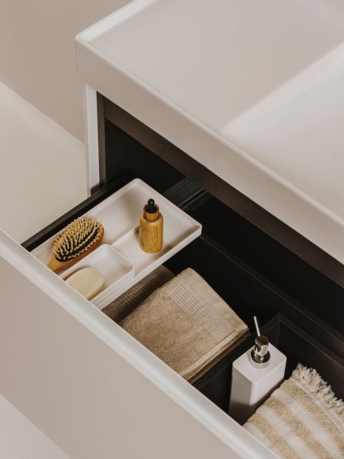Un’offerta variegata e progettata per rispondere senza sforzo ad ogni esigenza. A seconda delle dimensioni, è possibile integrare uno o due cassetti. Guide con caratteristiche soft close e cassetti completamente estraibili facilitano la movimentazione. Incorporando un organizer nel cassetto superiore, i mobili Ona garantiscono ordine perfetto con maniglie integrate.